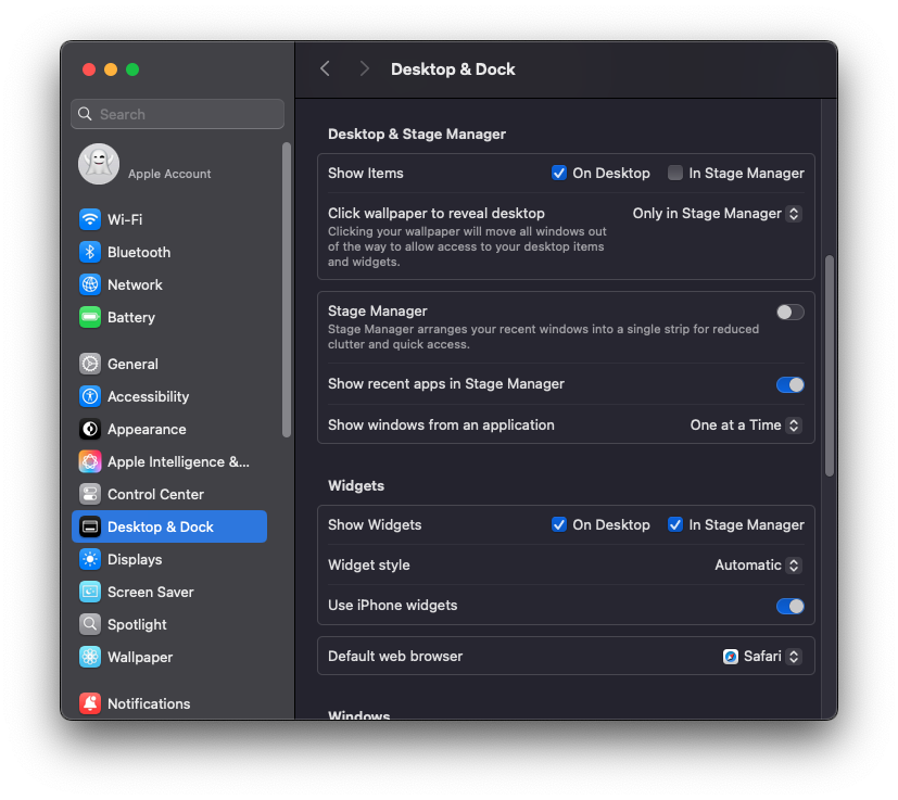 "배경화면을 클릭하여 데스크탑 표시" 옵션을 "항상"에서 "스테이지 매니저에서만"으로 변경 합니다.