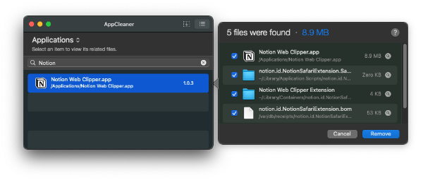 AppCleaner에서 삭제할 앱 검색 (예: Notion)