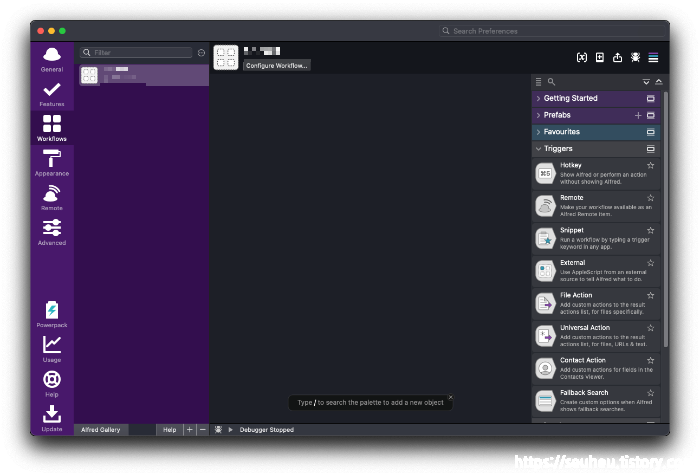 먼저 Alfred 실행 → Workflows 메뉴로 이동하여 "Create a new Workflow" 버튼을 클릭해 새로운 워크플로우를 만듭니다.